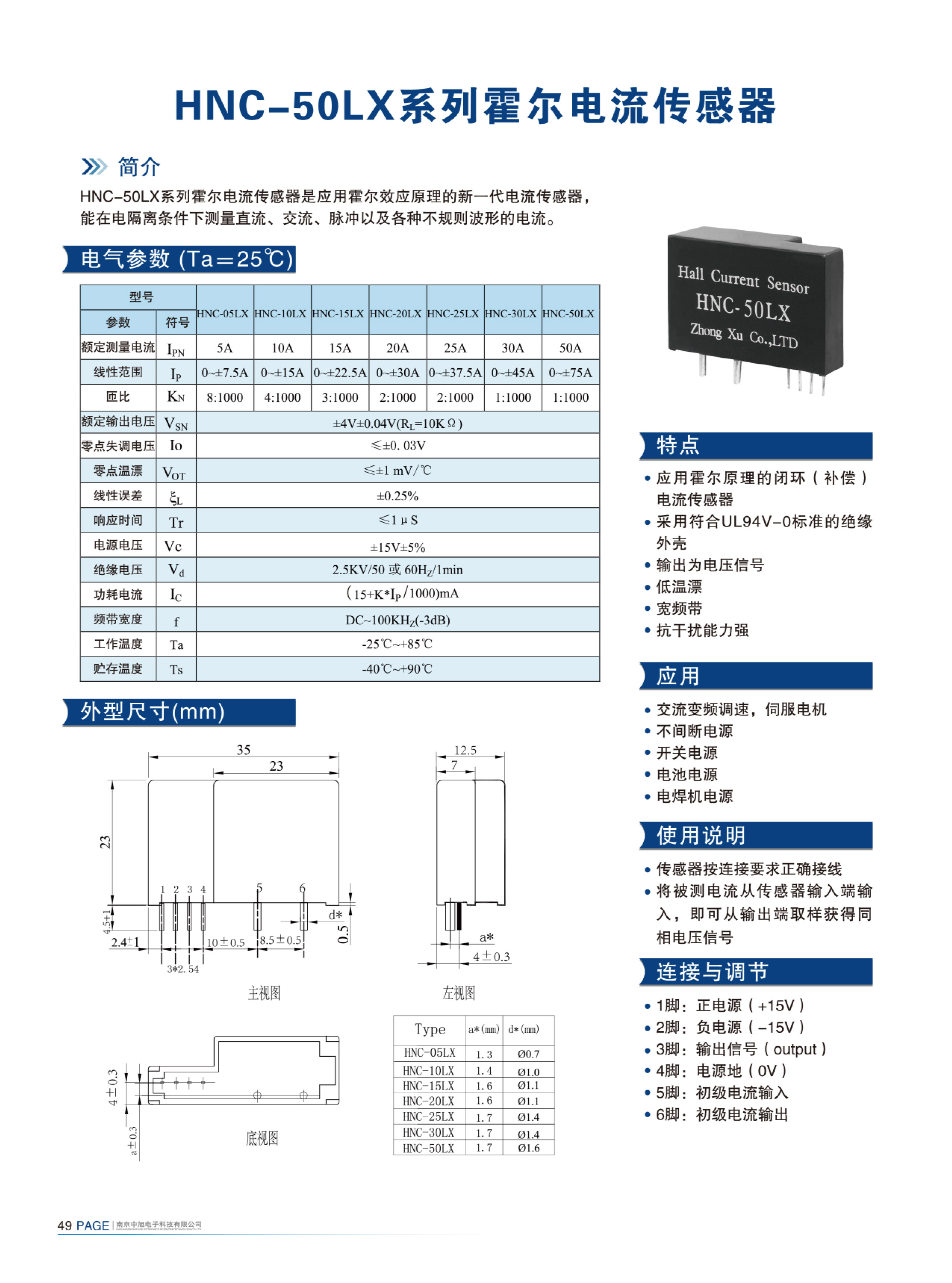 HNC-50LX series Hall current sensor is a new generation of current sensor using the principle of Hall effect. It can measure currents of DC, AC, pulse and various irregular waveform under electrical isolation.